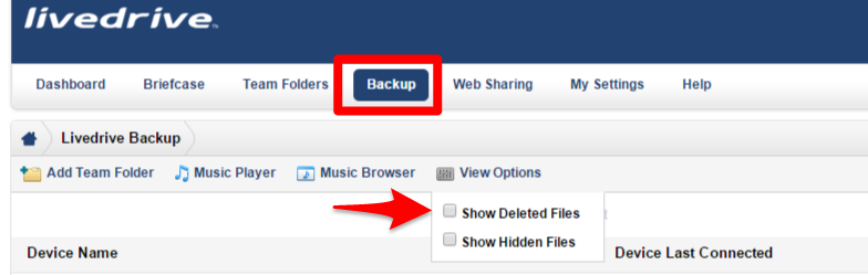 Deze bestanden kunt u eenvoudig zichtbaar maken door in de online portal te kiezen voor "Show Deleted Files" in het View Options menu in de backup (zie afbeelding). Na het aanvinken van de opties zullen de gewiste bestanden weer zichtbaar zijn op de originele locatie in de backup. LET OP: na 30 dagen zullen de gewiste bestanden echt worden gewist.
